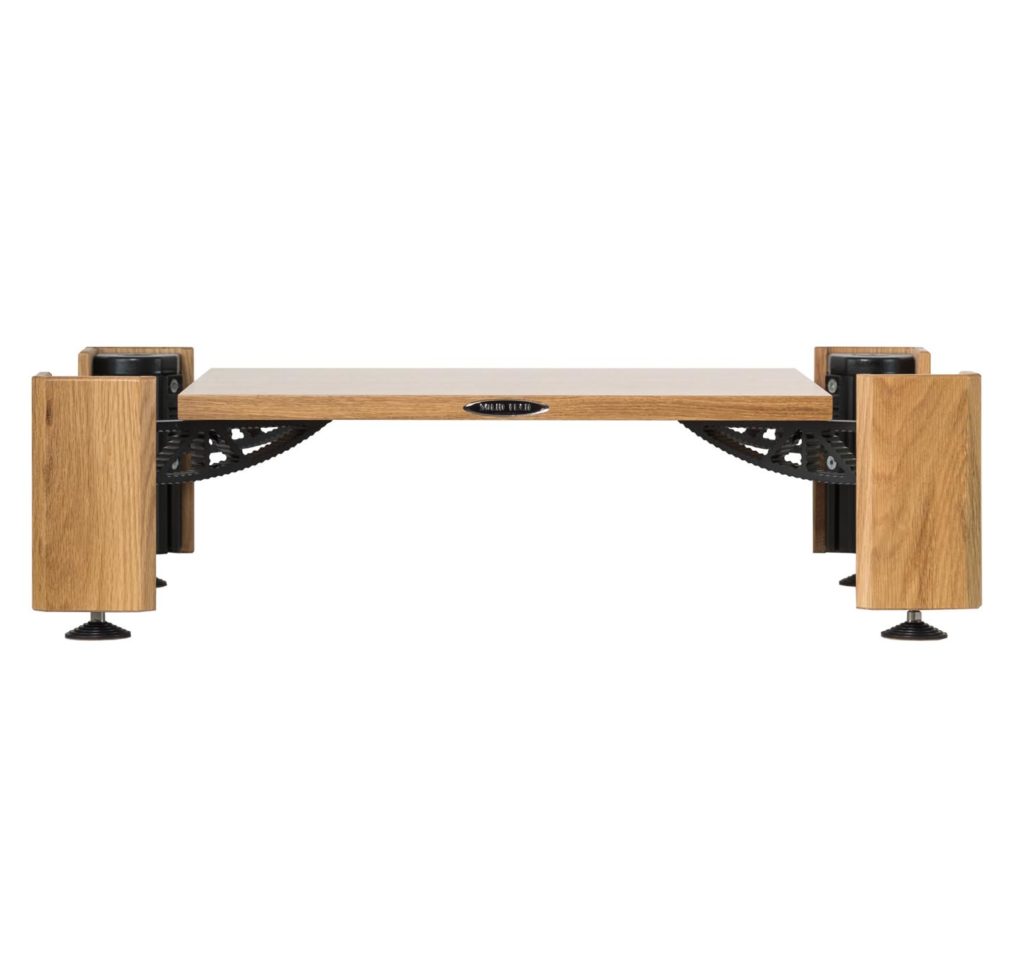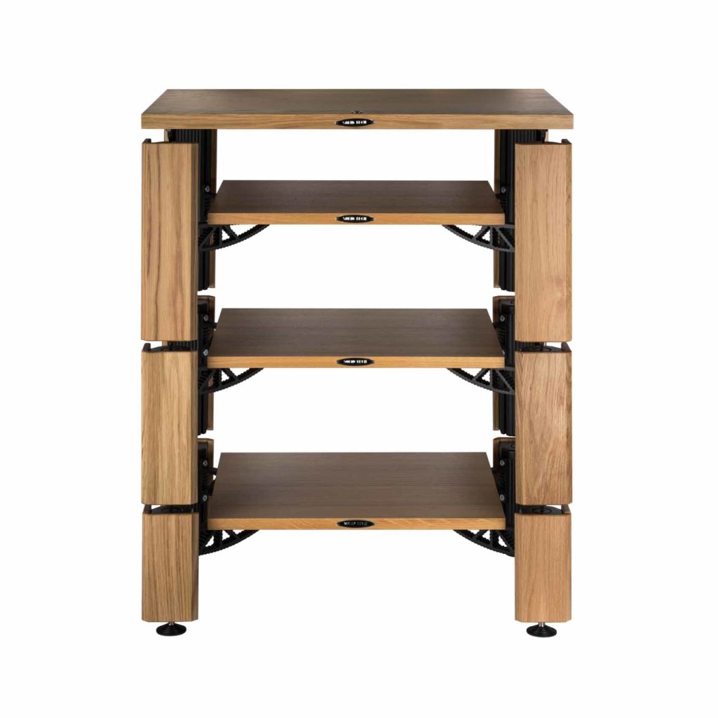 Hybrid wood in a 1-level design, here oak pillas and oak shelf. Technical details: Hybrid Wood with 1 shelf-kit Feet: Spike fixed Floor Protectors Total Rack height: 210mm Weight limitation middle shelves: 70kg